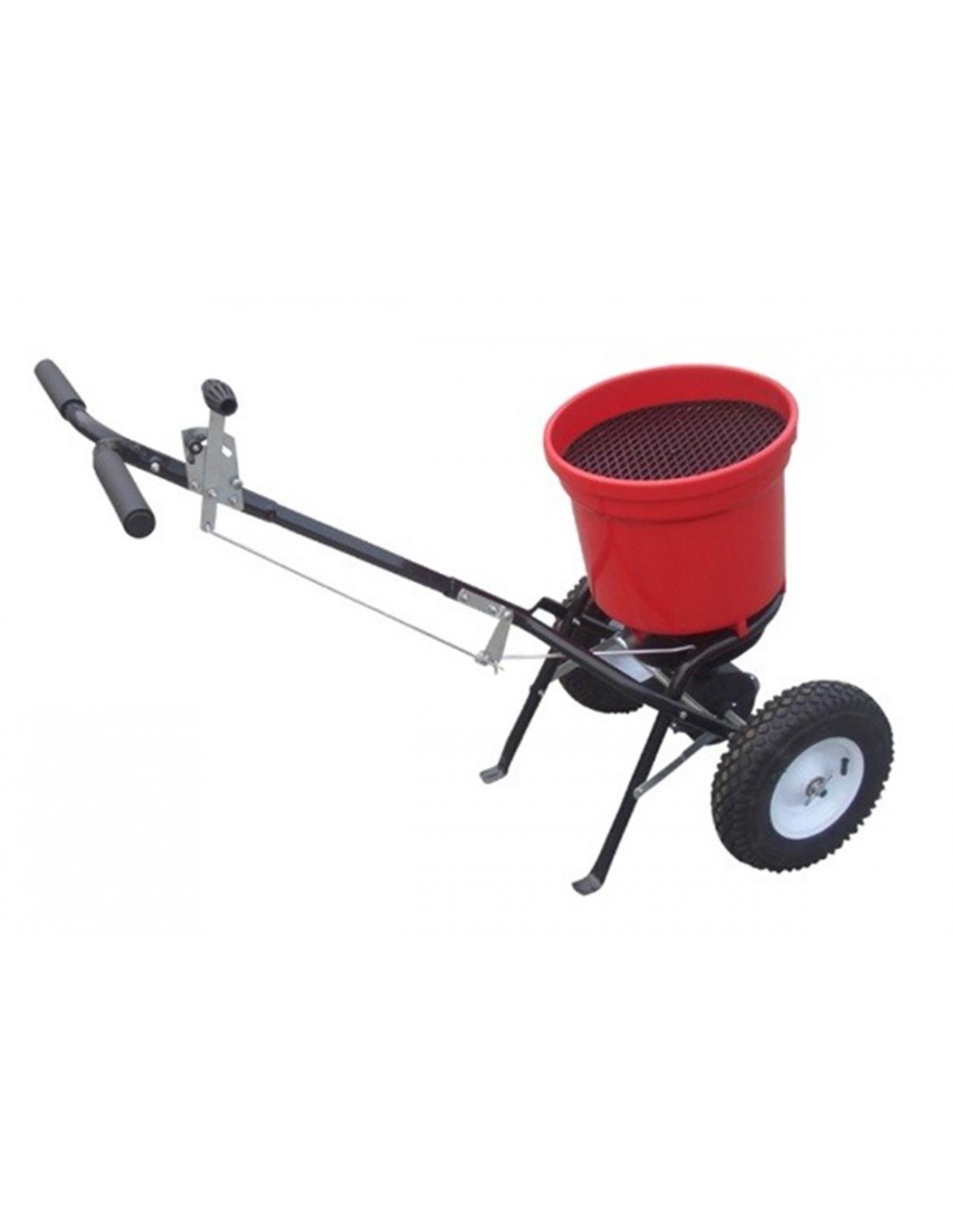 Strooier duwmodel Roteerstrooier Max. inhoud 25 kg - Luchtbanden Ronde bak met rooster om brokken meststof of zaad te verkleinen Debietregeling d.m.v. metalen stangen